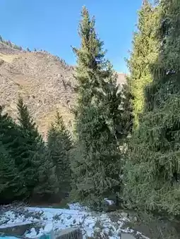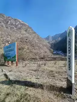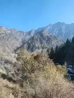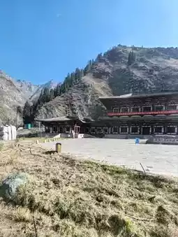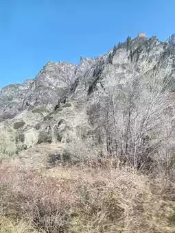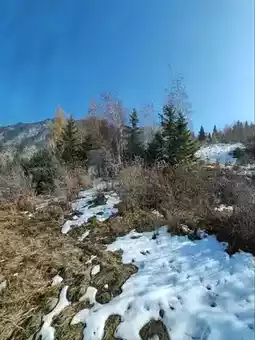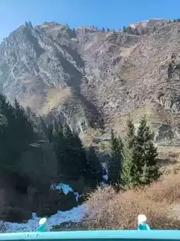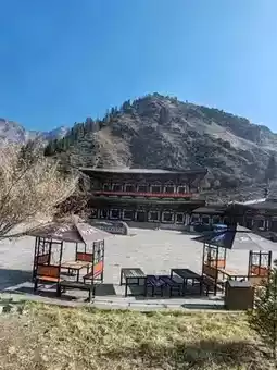 The shuttle bus travels through the mountains, offering soothing views of the late autumn and early winter landscape outside the window. Dry, rolling hills stretch endlessly, with exposed rocks and withered shrubs marking the seasonal transition. The road winds upward through the valleys, where traces of early snow add a touch of crisp chill to the air. A clear river flows through the gorge—sometimes calm as a mirror, reflecting the blue sky and bare trees; sometimes rushing and tumbling over rocks, churning up white foam. In the distance, a structure in antique style stands serene and dignified under the sunlight, adding a human touch to this majestic natural canvas. It was a journey back in harmony with nature.