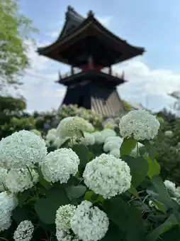 The shot of the temple bell in the bell tower and the hydrangeas is famous.