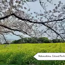 2) Nokonoshima Island Park: A flower park located on Nokonoshima Island. You can see cherry blossoms with a field of yellow canola flowers and a bright blue sea as a background. This is another highly recommended spot.