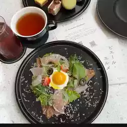 Pierre Hermé's two most popular macarons, pistachio macarons, cheesecake made with ganache chocolate and yuzu, and cold vegetable salad galette were also served