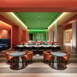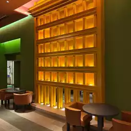 When you enter the lobby, you will be shocked by the high ceiling and huge pillars. The space is filled with interweaving of red, green and blue, and staggered light and shadow, creating a sense of being in a dream world. In the center of the restaurant is a water sculpture called "Dancing Water" designed by Shigeru Uchida. The water waves are projected on the ceiling, which is extremely romantic.