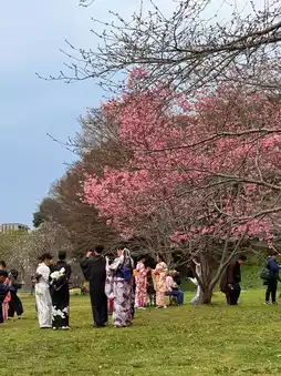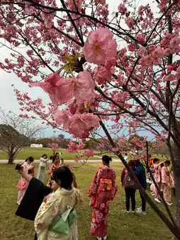 Not wanting to miss out on seeing more cherry blossoms in full bloom, I walked around Ohori Park and saw a pink cherry blossom in full bloom at Sannomaru Square near Ohori Park. Foreign students in kimonos were excitedly taking photos with the cherry blossoms. After some research, I found out that this plant is called Sunshine Sakura. It is characterized by single, bright pink flowers. It blooms earlier than Somei Yoshino. It was created by Mr. Masaaki Takaoka from Ehime. It is a cross between Amagi Yoshino and Taiwan's Kanhizakura. It was officially registered as a new variety in 1981.