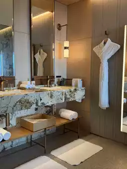 Two rooms were booked, a Premier Suite and a Bay View Twin Room. The suite covers an area of nearly 90 square meters, with a whole floor of floor-to-ceiling glass facing the bay🌊. When the weather is good, the view is so beautiful that you can't wait to pull the curtains😍. The layout of the room is quite special, the entrance is a promenade, the left hand side is the guest toilet, after turning right into the room, the left hand side is the cloakroom leading to the bathroom, then beyond is the screen separated bedroom plus office desk, the innermost is the living room. This design gives all areas of the room an unobstructed view of the bay🌅. I quite like the layout of the twin rooms, all functional areas are independent and sophisticated, the stay feels more spacious than the Tokyo Otemachi Four Seasons and Addison, however in practice instead the Fukuoka Ritz is the smallest. The hotel bedding is particularly comfortable, the mattress is moderately soft and hard, and the sheets and quilts are super smooth to the touch🛏️. But the only dissatisfaction is that the bathroom lighting is too dim, at night in the mirror can not see clearly, and the shower water pressure is small, bathing is a bit not cool enough😩.