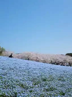 The blue Nemophila fields at Uminonakamichi Seaside Park in Fukuoka are considered one of the most beautiful flower viewing spots in spring. In early April, over a million Nemophila flowers bloom across an area of more than 12,000 square meters, creating a vibrant blue field that contrasts with the pink cherry blossoms from over 1,600 cherry trees, making the atmosphere romantic and impressive.