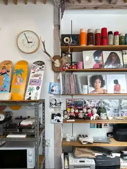 Located on the first floor of a building, the shop is compact at first glance, but its stylish logo and inorganic exterior catch your eye. Once inside, artistic posters and CDs are displayed, making it feel like a gallery. In fact, exhibitions and events in collaboration with local artists are often held.