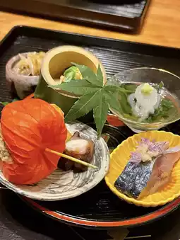 □ Hassun... Peach and water eggplant with white dressing, white shrimp and water spinach, sesame mackerel, soft boiled octopus, deep-fried mexicali with rice crackers, specialty tamagoyaki
