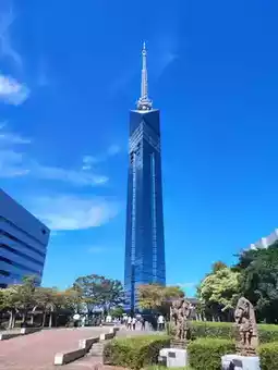 I arrived in Fukuoka in the afternoon and made a beeline for the tower. Located in **Momochihama**, a sleek, modern district by the sea, the tower’s reflective silver facade shimmered under the sunlight. The surrounding park was perfect for a quick stroll before heading up.