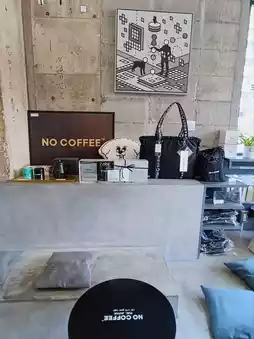 No Coffee is located between Hirao and Yakuin, and its unique design is evident from the exterior. The interior is styled with a gray color scheme, showcasing a minimalist and fashionable aesthetic.