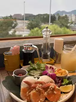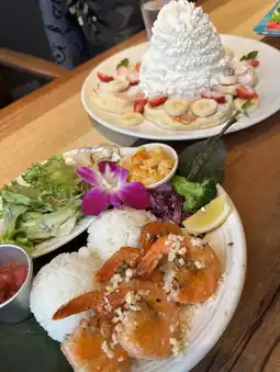 The menu has a wide variety of Hawaiian dishes, such as pancakes🥞, burgers🍔, garlic shrimp🦐, and loco moco rice bowls🥚, so you'll want to come back again and again until you've conquered the menu!