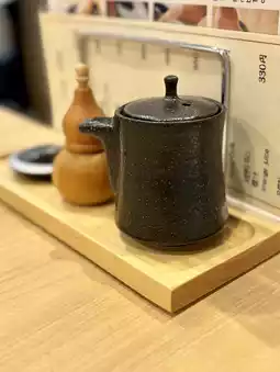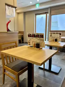 The interior of the restaurant is a calm and cozy space with a warm wooden design, offering a clean and relaxing dining experience.