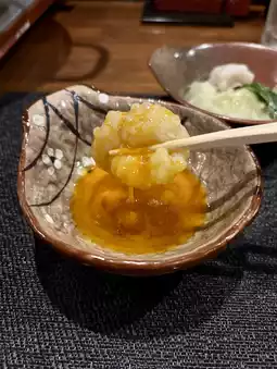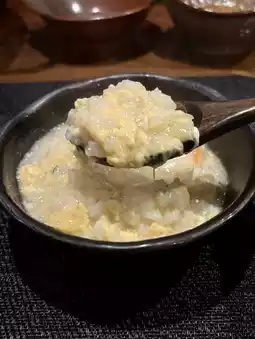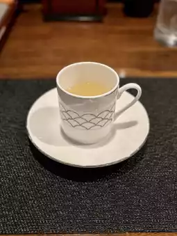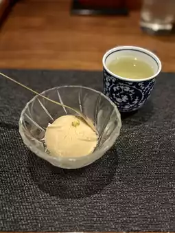 The meal concludes with Shiso Zosui, a rice porridge infused with the hot pot's umami flavors and the refreshing aroma of shiso leaves, offering a comforting and satisfying finish. For dessert, Yame Tea is paired with a sophisticated pistachio ice cream, blending Japanese and Western flavors for a delightful end to the meal.