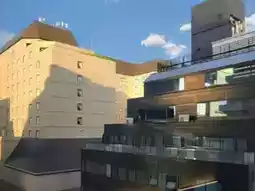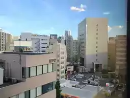 On both sides, you can see other hotels in the Hakata area, and to the right, you can catch a glimpse of the sky between the buildings. The sink is uniquely positioned near the window, which is convenient for quick touch-ups.