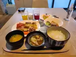 The menu features local Fukuoka specialties like rich and flavorful motsunabe (hot pot) and generously sized mentaiko (spicy cod roe), which are enough to make the meal perfect. The sausages are in great condition, and the grilled fish is delicious. It’s a fantastic breakfast. Thank you!