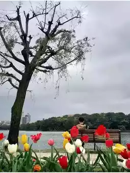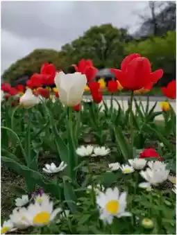 - A large park in the city center with a long street of cherry blossoms. There are also other flowers in the garden, such as tulips.