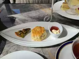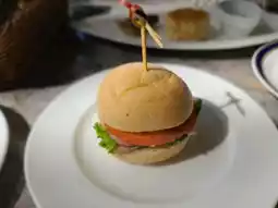 The menu was diverse. The savory items featured a bacon chicken burger sandwich, a salad plate with salmon, cheese, and jamón, quiche, and scones served with clotted cream.