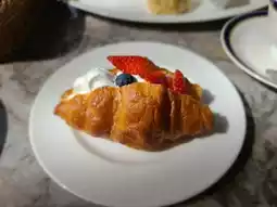 The sweets selection included five items, such as a fresh cream strawberry croissant, a macaron perched atop ice cream, and a seasonal fruit bowl, offering a rich and satisfying variety. The sunlight and shadows reflecting on the pool added to the beauty of the experience.