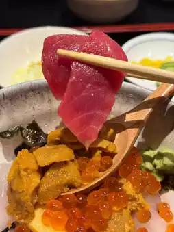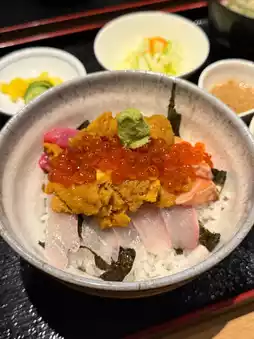 About ten minutes from Akasaka Station, the store is not difficult to find, in an alley, the area is not popular, there is a big shopping mall, open at 5:30 pm, no need to queue up if you go at 5:45 on Wednesdays, the waitress is very enthusiastic, the menu is not in Chinese, the sea urchin donburi is 1950 yen, but the night set meal is 2150 yen, about 105 yuan, and there is no tax!!! I ordered a sea urchin bowl and a seafood bowl, and also ordered the soy sauce live fish sashimi recommended by my sister. I didn't have to order drinks, and it was served with ice water. The bowl was very large, the sea urchin was fresh and not fishy. It was a little bitter when eaten alone, but the soy sauce flavor came out. The price is really good for the price. The seafood bowl has sea urchin, tuna, lionfish, and salmon roe, all of which are very fresh! The soy sauce sashimi was a pleasant surprise. It was very fresh without any seasoning and not fishy. It was served with sesame, green onions, seaweed, mustard, and then sesame paste was added to mix and eat together, which was another flavor! Figure 3 shows all the dishes eaten by two people. The bill was 265 yuan. Overall, it is worth recommending. Good products, good service, and good value for money! #海胆