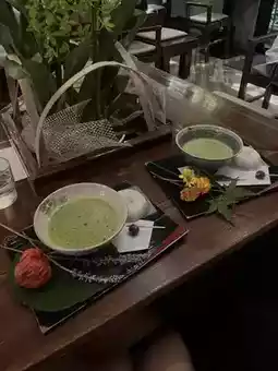 Matcha set with a piece of plum cake fresh flowers as decoration is very ceremonial