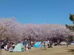 When traveling to Japan during the cherry blossom season, we often wonder where the Japanese celebrate their Hanami (flower viewing) festival. Today, we found the answer by visiting Uminonakanichi Seaside Park. From Tenjin-minami Station, taking the 25A bus directly to the park, the bus was full of Japanese people dressed in their finest attire, carrying camping gear, and carrying their children and grandchildren. When we reached Marine World Uminonakamichi Station, we all got off at the same time. From the station, it was almost a half-hour walk. They rent bicycles and scooters, but we were afraid of falling, so we walked slowly. The weather was also nice. I recommend getting a map in front of the park, which you can grab or take photos of, as the park is incredibly large. There's a playground and an aquarium, but the highlight of our visit today was the blue flower field, also known as Nemophila, in full bloom alongside the cherry blossoms. Luckily, we visited during peak season, but it was also crowded. Japanese people were laying out Hanami mats everywhere.