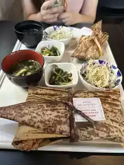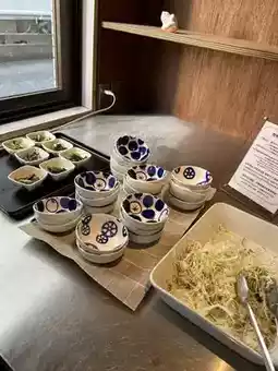 Enjoy a Japanese breakfast with domestic rice rice balls, miso soup, salad, and vegetables.
