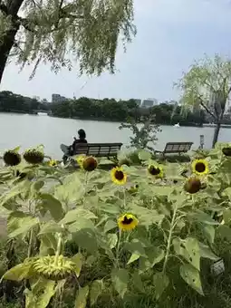 By the lakeside, sunflowers basked in the sunlight, some already bowing under the weight of their heavy heads, signaling the change of seasons. I saw people resting on benches, enjoying a moment of peace, while swan boats glided leisurely across the lake in the distance.