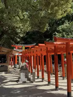 The most striking feature is the long, vermilion torii tunnel and the adjacent Inari area. The vibrant vermilion torii gates appear vibrant and vibrant in the sunlight, creating a striking contrast with the lush greenery surrounding them. Stone fox statues, messengers of the Inari god, can be seen at or near the torii gate entrances, each bearing a majestic yet graceful presence. Though short, the torii path exudes a powerful presence, inviting one to follow the vermilion's guidance and journey deeper into the mysteries.