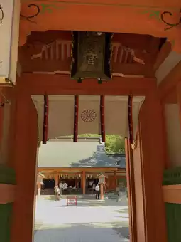 Further along, a vermilion gate stands before you. The gate's vibrant colors and clean roof lines are complemented by the ema (painted horse) hanging in front and the guardian deities flanking the gate, all imbued with traditional Japanese style. Passing through the gate, one enters the heart of the shrine.