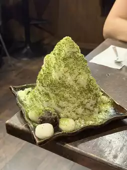 3️⃣ Matcha Shaved Ice: A towering matcha ice dessert dusted with aromatic matcha powder, accompanied by red beans and mochi. Refreshing, visually stunning, and a perfect palate cleanser. @YukinoSho