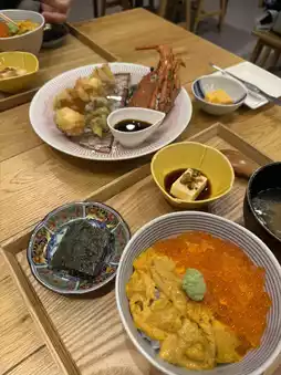 6️⃣ Sea Urchin and Salmon Roe Rice Bowl: A bed of rice topped with sea urchin and salmon roe, delivering a burst of fresh, sweet, and savory ocean flavors in every bite. @KanekatsuShokudo