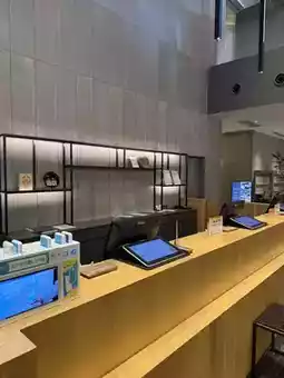 The lobby is softly lit and open, featuring a self-service laundry machine, coffee machine, and shared lounge, allowing travelers to freely connect, stay overnight, or work remotely.