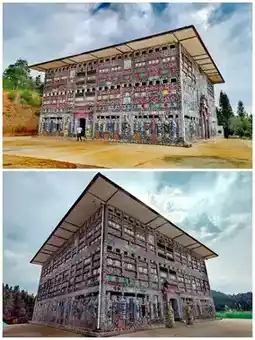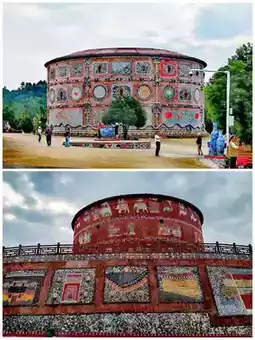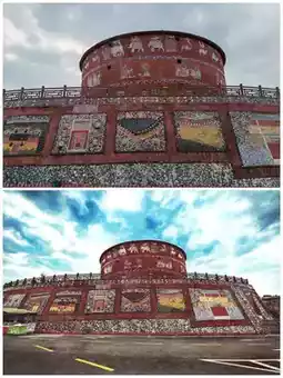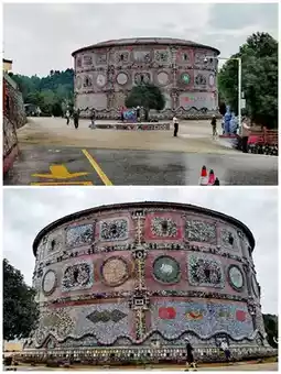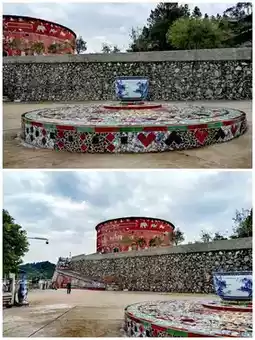 The Millennium Porcelain Palace resembles a giant, colorful, round "cake." Its interior and exterior walls are inlaid with over 60,000 pieces of porcelain and 80 tons of porcelain shards, including the four famous porcelains of Jingdezhen: blue and white, linglong, famille rose, and color glaze. With half of each porcelain piece embedded in the walls, the design is ingenious. Many of the pieces are high-quality porcelain fired in wood-burning kilns during the 1980s.