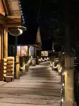 Small log cabins are scattered throughout the surrounding forest. Enveloped in the tranquility of the forest and its warm light, even a stroll is soothing.