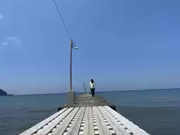 The bare light bulbs on the pier, the wooden structure, and the open view of the sea and sky evoke a "Showa retro" atmosphere!