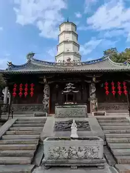 Dingguang Temple in Fuzhou, also known as Dingguang Pagoda Temple or commonly as White Pagoda Temple, is one of Fuzhou's famous temples and a provincial-level cultural relic protection site. Originally built in 905 AD during the Later Tang Dynasty by Wang Shenzhi, the King of Minyue, the temple includes the White Pagoda (also known as the Bao'en Dingguang Duobao Pagoda), a renowned Fuzhou landmark. The Vairocana Hall is the temple's grandest structure. Its elegant, curved roof ridge is inscribed with "Buddha's Light Increases, Dharma Wheel Constantly Turns," and features flying dragons at each end flanking a large orb. With its double-eaved roof, surrounding corridors, inscribed pillars, and antique octagonal palace lanterns, the hall evokes both a solemn Buddhist sanctuary and a lavish palace. Inside, the layout is meticulously arranged. Vairocana Buddha sits at the center on a large lotus throne, hands in a mudra, a smile gracing his face. To his left is Manjushri Bodhisattva, riding a blue lion and holding a wisdom sword, and to his right is Samantabhadra Bodhisattva, holding a ruyi scepter and riding a six-tusked white elephant. Further inside, Amitabha Buddha and Bhaisajyaguru Buddha are enshrined on either side. With both the Buddhas of the Three Worlds and the Three Sages of the Flower Garland Sutra represented, the hall is truly comprehensive. Bowing before these exquisite Buddha statues brings a sense of peace, clarity, and belonging.