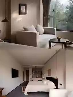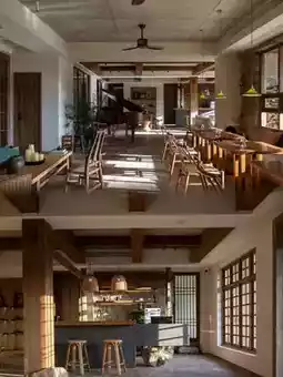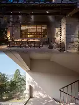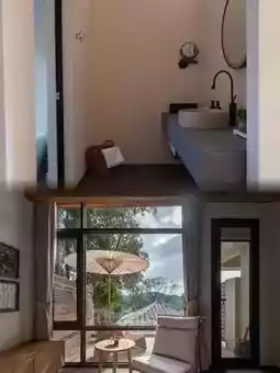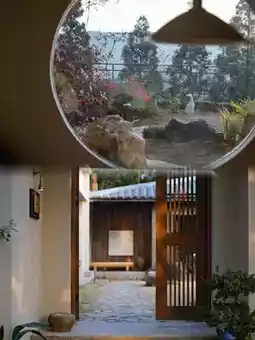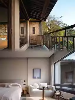 The homestay's main structure features minimalist geometric lines, with designers skillfully incorporating natural materials like rammed earth, raw wood, and bluestone, creating a textural dialogue with contemporary art installations. Suspended metal sculptures at the entrance converse with aged wooden posts, while abstract oil paintings around corridor corners echo the bamboo forest views outside.