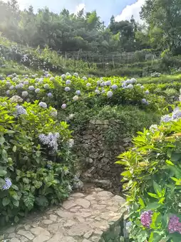 Using the valley terrain, flower fields are planted at different heights. Some plants are as tall as a person, standing there gives you a hydrangea background, with flowers covering the hills behind.