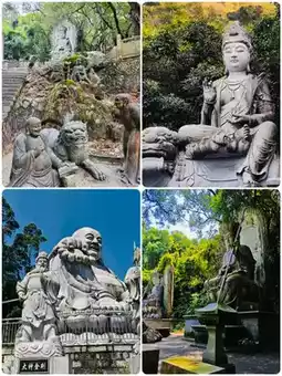 A group of Arhat statues hidden in the mountains, each expression vivid and lifelike! The sunlight filtering through the leaves creates stunning light and shadow effects
