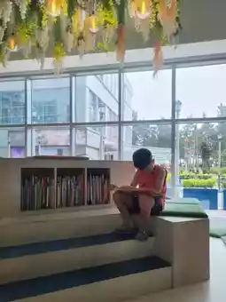 The check-in center has books neatly arranged, creating a cozy library-like atmosphere.