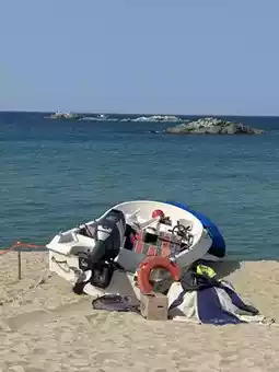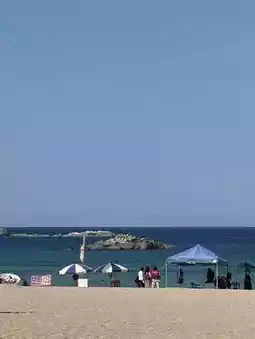At the beach, there were people busking, some already enjoying swimming, and others riding boats.