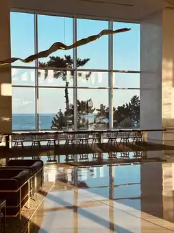 SEAMARQ Hotel is not just a hotel; it is an architectural icon, designed by world-renowned architect Richard Meier. The hotel’s structure—a gleaming, elegant tower set against a backdrop of dense pine trees—is intended to create a dialogue with the natural landscape. The design utilizes a minimalist color palette of white and glass, allowing the natural light and the changing colors of the sky and sea to become the primary decor. The magnificent curved staircase and the grand, two-story lobby, which opens seamlessly to the sea, are signature elements that embody the architect’s philosophy of purity, clarity, and harmony with nature.