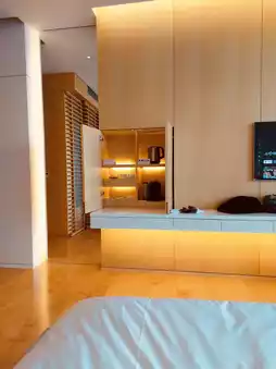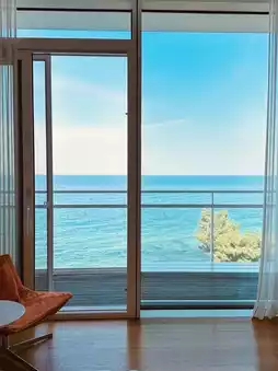 The luxury experience extends into every room at SEAMARQ Hotel. The accommodation features a clean, modernist interior with light wood floors and premium, minimalist furnishings. All rooms feature a balcony and are positioned to maximize the view, looking out over the sea, the lake, or the mountains. A standout amenity is the large, deep soaking tub and rainfall showerhead in the bathroom (available in Premium and Suite rooms). This setup allows guests to relax and enjoy the scenery in absolute privacy. The attention to detail, from the ambient lighting to the premium bedding, ensures superior comfort expected of a top-tier five-star stay.