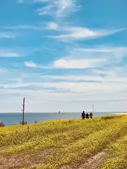 The real magic happens where the coast meets the park. Here, the utilitarian tetrapods (breakwaters) have been painted in vibrant reds and blues (and other pastel shades), injecting a playful, artistic pop against the deep sea tones. Adding to this visual spectacle is the seasonal flourish: in autumn, the fields near the park burst with glorious yellow cosmos (or bright canola in spring), creating a breathtaking blend of yellow, blue, red, and white.