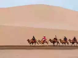 Ride camel or sandboard on desert dunes around Dunhuang at sunset