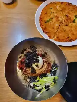 This spot serves noodles without broth initially, like a bibim-style dish, and then you pour the broth in later. It was absolutely delicious! But what really stood out was the mung bean pancake—it was so good, it felt like a pizza-level treat. Highly recommended!