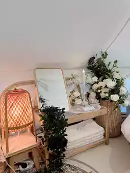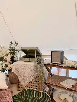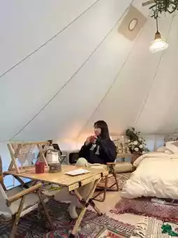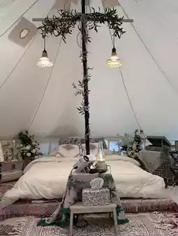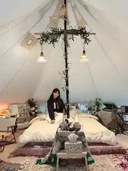 Being a glamping zone, bedding, heating, and amenities are fully equipped.