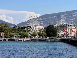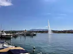 The Jet d'Eau at Lake Geneva is a massive artificial fountain located on the shores of Lake Geneva. Using high-pressure pumps to draw water from the lake, it shoots water up to a height of approximately 140 meters, making it visible from many parts of Geneva.