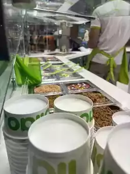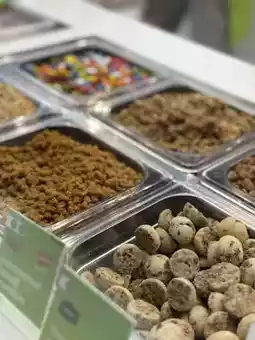 This is a yogurt ice cream shop that has a sweet and sour taste. There are many toppings to choose from, depending on the size you choose, S M L. We ordered size L and got 3 toppings. It is yogurt ice cream that goes with fruits or their caramel sauce. It is very delicious. It is easy to eat and fun to eat. Plus, the scoop is cute. It is green, similar to aloe vera. It is beautiful to take pictures. The shop has a place to sit and eat.
