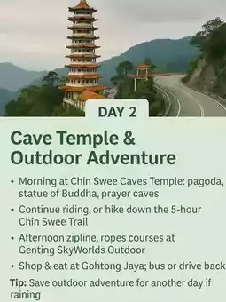 Start your morning surrounded by clouds at Chin Swee Caves Temple — home to a golden Buddha statue, peaceful prayer halls, and a 9-story pagoda that pierces the sky. Walk the Chin Swee Trail, a scenic path through mountain air and silence.