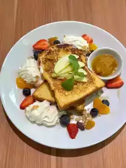 • Peri-Peri Chicken: Grilled boneless chicken thigh marinated with spices, served with French fries, garden salad, and the café’s signature Peri-Peri hot sauce.