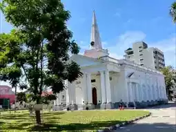 Located near the Penang State Museum and Art Gallery, the church has a large green lawn and is quite magnificent with its towering spires, light blue marble floors, columned porches and symmetrical proportions.